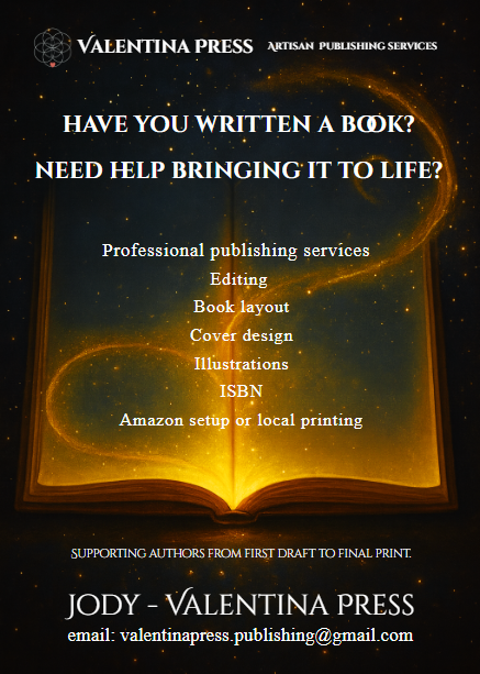 If you have a story, idea, or manuscript you feel ready to bring into the world, Valentina Press offers calm, supportive guidance from first draft to finished book. We work with authors at every stage, providing editing, proofreading, layout, illustration support, and publishing guidance, including print and self-publishing options.
